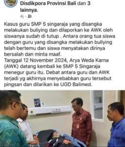 Buleleng, Siagakota.net- Ketua Dewan Pendidikan Buleleng, Dr. Made Sedana,M.Pd., menanggapi kasus guru SMP 5 Singaraja yang disangka melakukan bullying (perundungan) dan dilaporkan ke AWK oleh siswanya sudah ditutup.